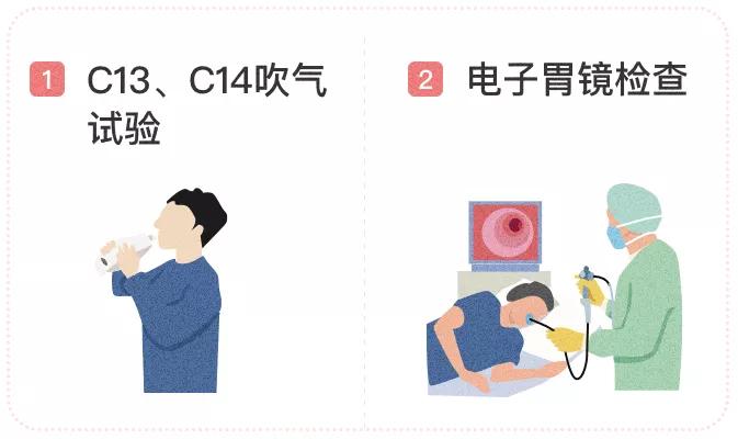 幽门螺杆菌的检查方式有两种: C13、C14吹气试验或者胃镜检查。