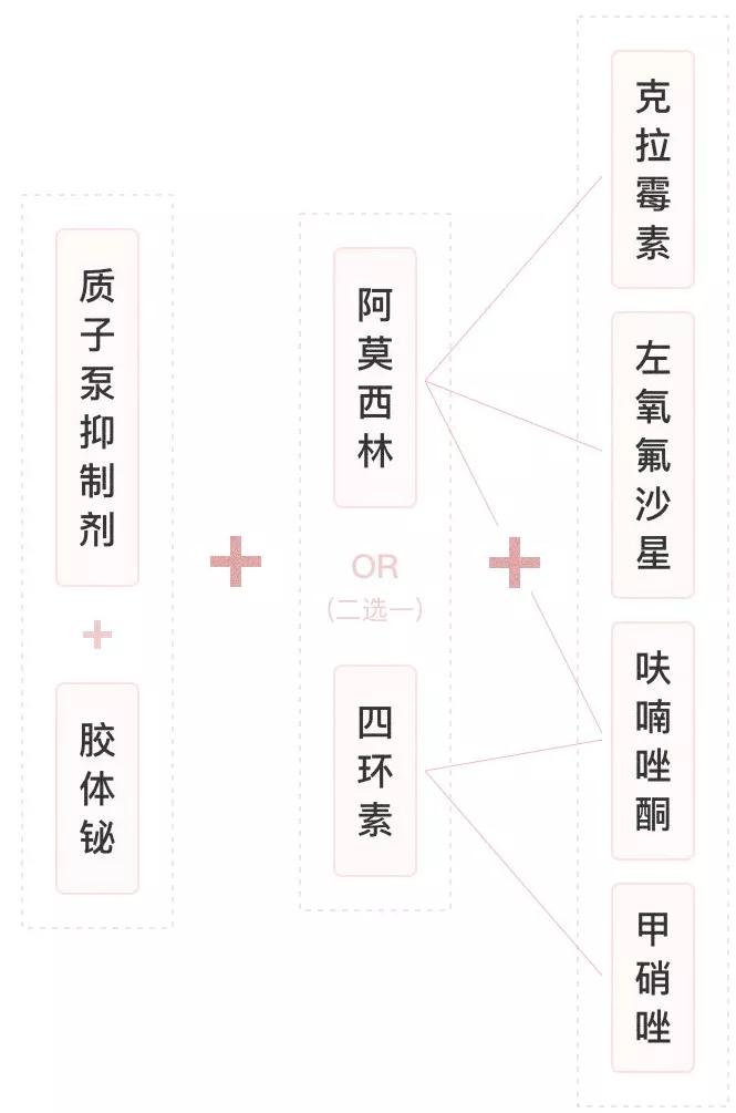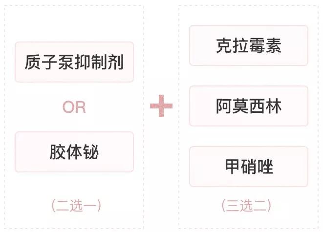 也就是,质子泵抑制剂/胶体铋(两者选一)+克拉霉素、阿莫西林、甲硝唑(三者选二)。