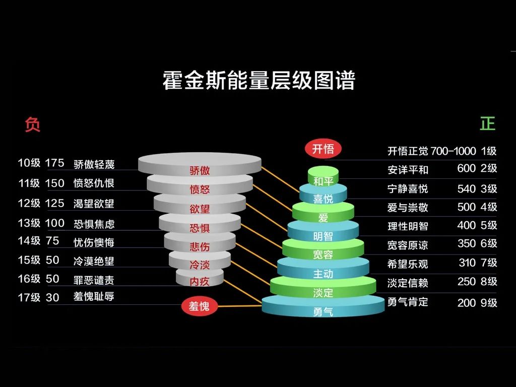 “霍金斯能量层级图谱”,是由美国著名心理学家、精神医学博士、哲学博士大卫·霍金斯通过实验研究以及二十年的临床实验,发现人类各种不同的意识层次都有其相应的能量指数,并且将这些能量指数大致划分了17级。